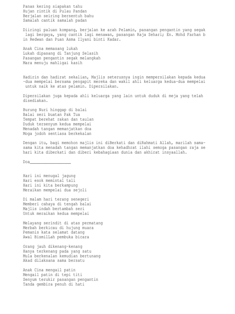 1 TEKS PENGACARA MAJLIS MAJLIS PERKAHWINAN SHAM ATIKAH DI PUSAT KOMUNITI SENTUL PERDANA KUALA LUMPUR 13 MAC 2010 Panas kering siapakan tahu Hujan rintik di Pulau Pandan Berjalan seiring bersentuh bahu Samalah cantik samalah padan Diiringi paluan kompang berjalan ke arah Dewan. Published on July 19 2018.