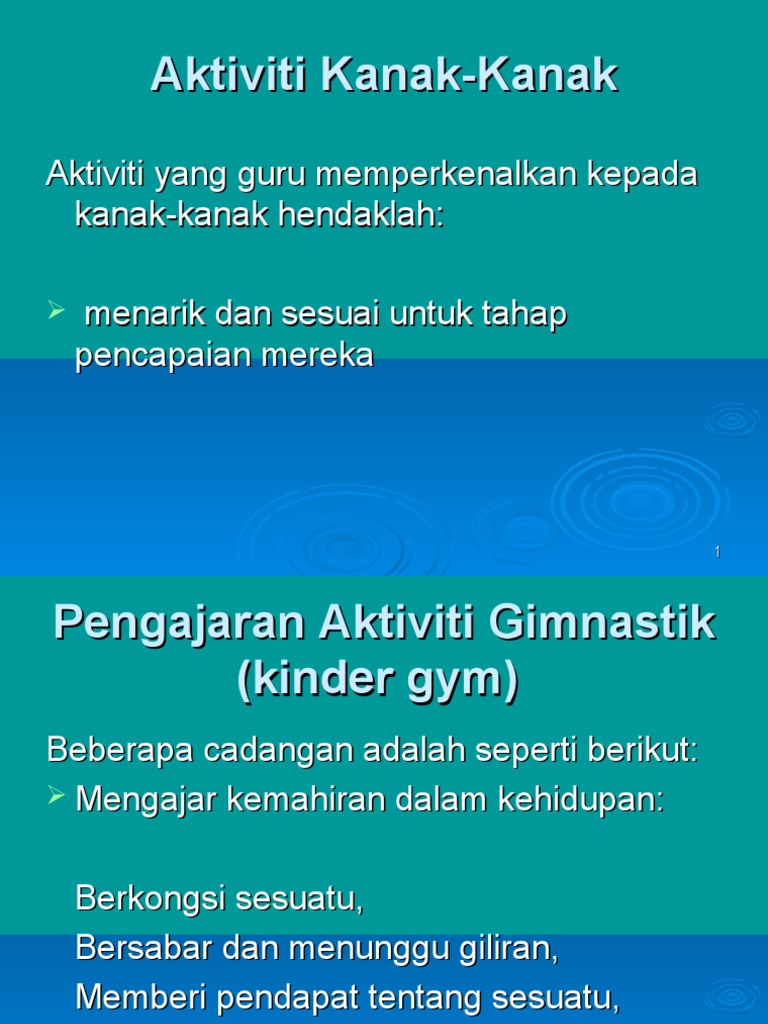 Sebagai contoh guru menepuk satu bar ritma dan kanak-kanak. Kalung Pasta dicat Picklebums. Selain dapat menyihatkan tubuh badan aktiviti ini juga boleh melatih anak anda supaya belajar mengawal badan dan otak bagi menghasilkan pergerakan yang sesuai dengan.
